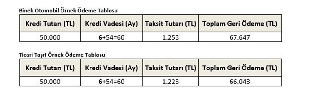 İkinci el binek araç (motosiklet dahil) veya ticari araç satın alacak bireysel/kurumsal müşterilere yüzde 0,82 faiz oranı ile taşıt kredisi imkanı sunulacak. Azami 6 Ay Ödemesiz toplam azami 60 Ay Vadeli 2. El Binek Otomobil ve Ticari Taşıt Kredilerinde azami limit 150 Bin TL olacak.